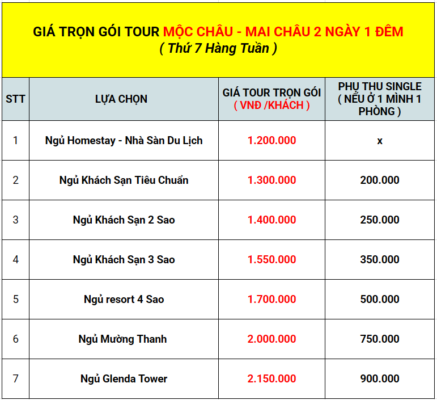 - 01 đêm nghỉ tại Mộc Châu theo tiêu chuẩn đăng ký.