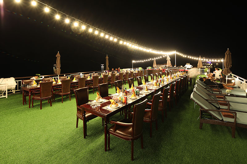 19:00: Quý khách dùng bữa tối tại nhà hàng của du thuyển với những món ăn được chế biến một cách cầu kỳ và tinh tế của đầu bếp trên du thuyền. Sau bữa tối, quý khách tự do nghỉ ngơi, tham gia các trò chơi, câu cá, câu mực, thưởng thức đồ uống tại quầy bar ngoài trời, cảm nhận vẻ đẹp vịnh Lan Hạ về đêm …