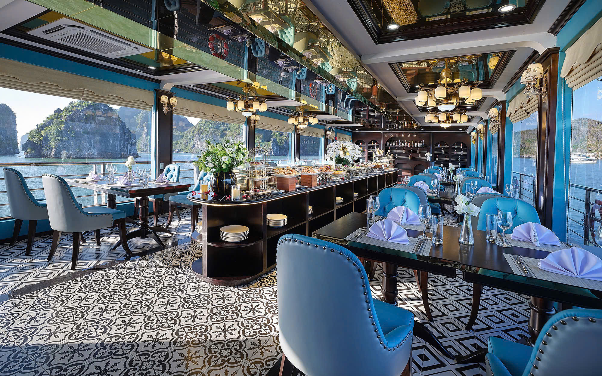 Qúy khách dùng bữa trưa tại nhà hàng sang trọng trên tàu với những món ăn hải sản đặc sắc của vùng biển Hạ Long. Trong lúc thưởng thức bữa trưa tại nhà hàng Quý khách sẽ được nghe một giai điệu du dương, ấm cúng, lãng mạn.
